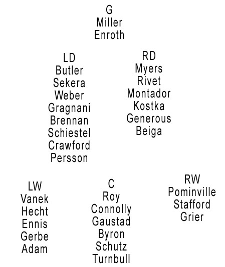 Players that would be out: Tim Connolly, Drew Stafford, Mark Mancari, Matt Ellis, Adam Mair, Toni Lydman, Henrik Tallinder, Andrej Sekera and Patrick Lalime.
