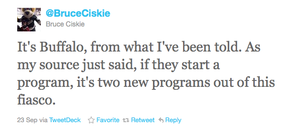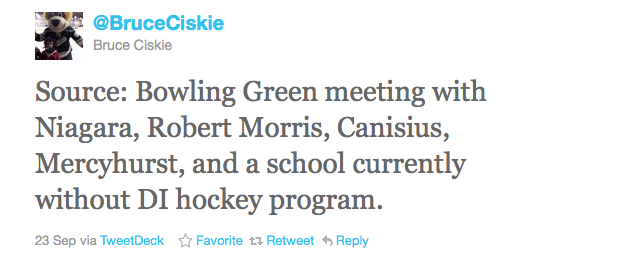 According to @BruceCiskie UB was part of a group that met with Bowling Green discussing hockey. The other four teams were the ones who previously met with the CCHA. He did point out that there is no indication where the talks may be leading for the future of UB’s program, or the group as a whole.