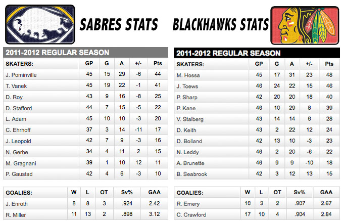 BUF: Ryan Miller — CHI: Corey Crawford