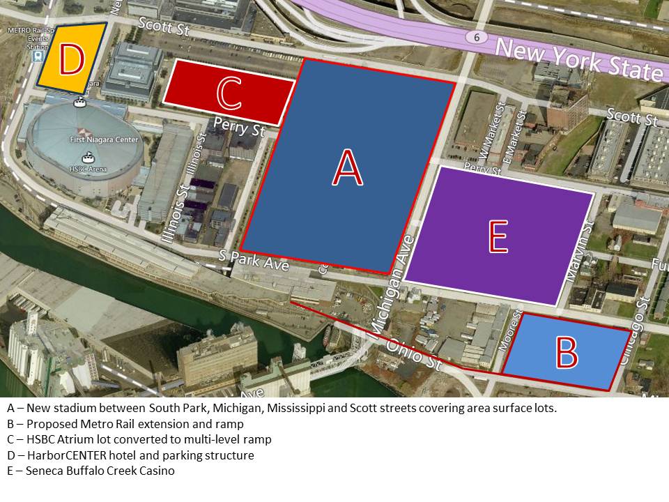 First consider that First Niagara Center, HarborCenter, the Seneca Casino and the Canalside developments would all be a pitching wedge away from the stadium. In addition to the proposed NFTA rail extension that could provide a light rail stop right at the back door of the stadium.