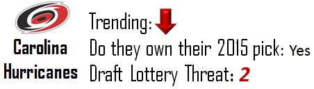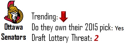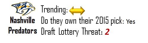 Nashville is sitting in limbo and just barely out of the top-10 in this year’s draft. A full year of Pekka Rinne ought to give the squad a few more points as should a slightly more experienced Seth Jones. They still need more goal scoring and if they decide to ship it for more help and still miss the playoffs, it could wind up seriously boosting the lottery percentage of the team that obtains it.