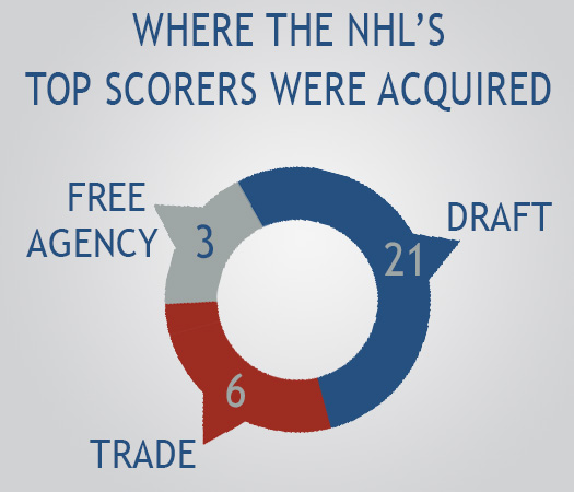 The first order of business was to find out how much space on a roster do players acquired via the draft take up? There are obviously three main ways teams go about acquiring players: via draft, trade, and free agency (players signed as undrafted, college, or junior free agents are included in free agents); less than two percent of players in the league were acquired by their current teams via the waiver wire. As for the three main avenues clubs can take, the averages didn’t show anything overly surprising; the average roster was filled out roughly 38% via the draft, nearly 30% by way of trade, and just above 29% via free agency. It certainly makes sense for rosters to have more players that were acquired via the draft than any other option, but it doesn’t tell the whole story. When looking at who accounted for all the points scored throughout the league the data showed that 47.93% of points league-wide were scored by players who were acquired via the draft. Players that were brought in via trade were responsible for 29.5% of the points, and free agent signings accounted for 21.95%.