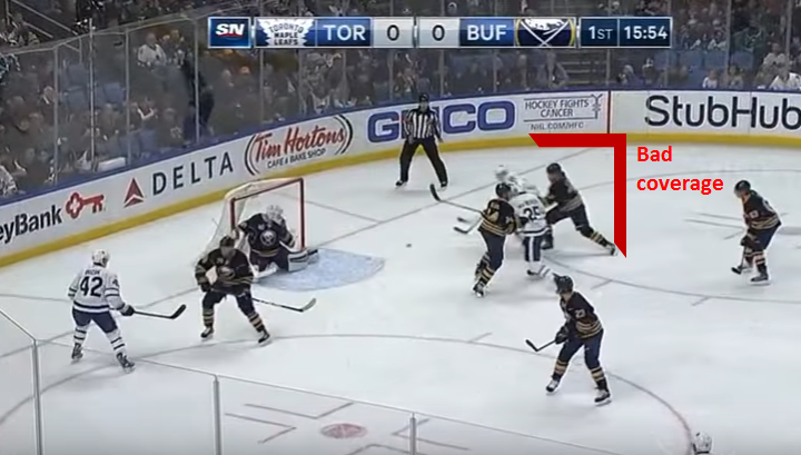 Girgensons is well off Bozak while Casey Nelson is rather high in the slot considering Bozak’s position. This is possibly because the Sabres were beginning their breakout as Girgensons picked up the puck behind the net.