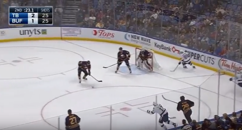 The Sabres are in full chaos now as McCabe was at a disadvantage defending Killorn based on how Baptiste collected the puck after the three-on-two. Cody Franson is stuck vacating the crease to chase the loose puck and Kucherov and Baptise is still below the circles, roughly marking Johnson.