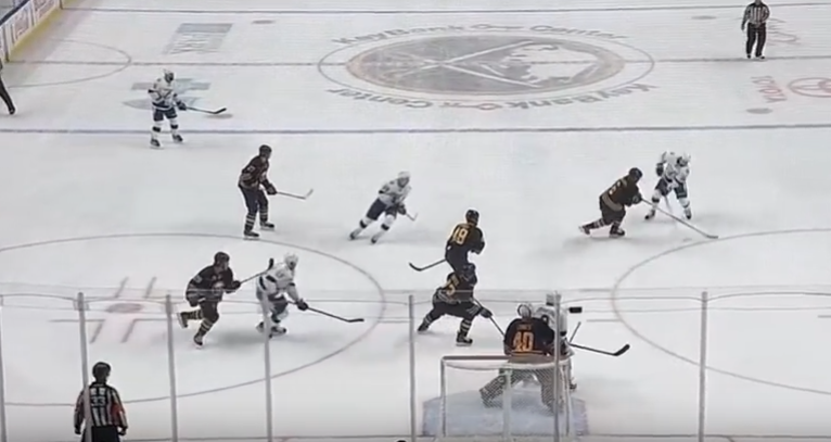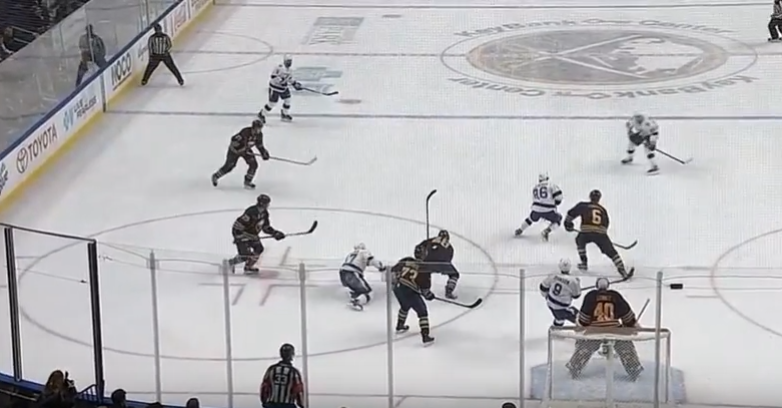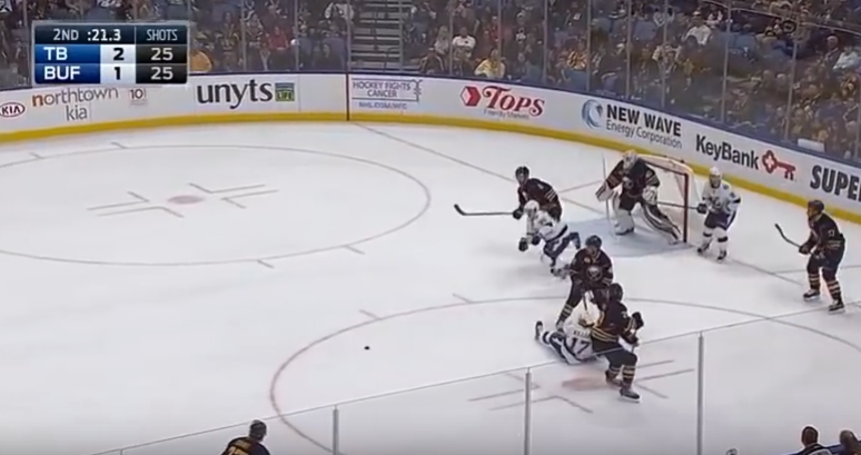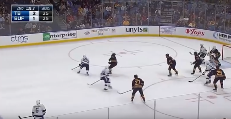 As for Thursday’s outing, one goal that really irked me was Tyler Johnson’s deflection goal. It was a great tip on a play that started off a pair of giveaways by the Sabres. The first isn’t pictured as the highlights of Thursday’s game didn’t include it, but another stretch pass through the neutral zone didn’t get home and sent the Lightning in with numbers. All three Buffalo forwards were behind the puck as Tampa gained the zone and it left Buffalo chasing for the entire play.