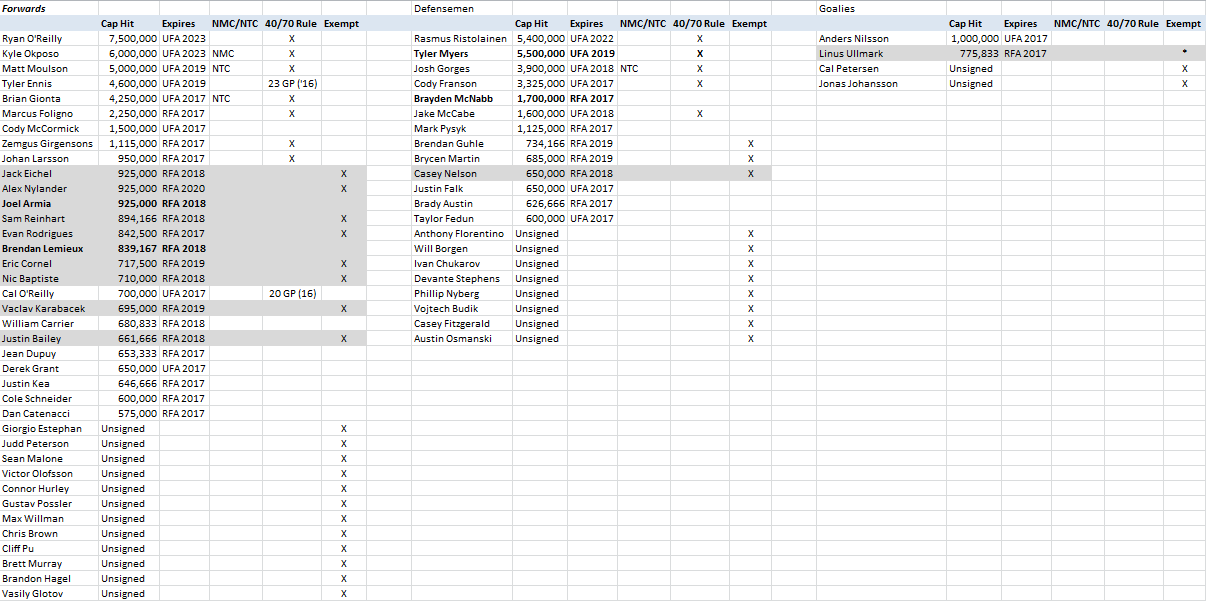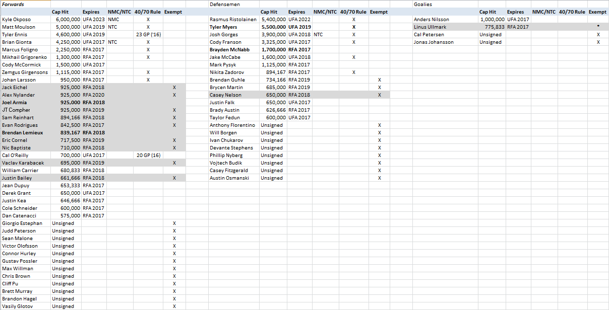 The good news for the Sabres is they get just over $9 million in relief this summer. Brian Gionta, Franson and Cody McCormick’s deals come off the books and you can add in another $4.3 million for Kulikov assuming he’s not retained. Buyouts to Gorges and Moulson would give some more relief as Gorges would account for a $1.3m hit for the next two years and Moulson would account for $2.833m, $3.833m and then $833K for two more seasons (it’s probably best to keep Moulson). So there’s certainly cap relief coming this summer – and that doesn’t even account for any stroke of luck they might encounter if Las Vegas takes a heavy cap hit off their hands.