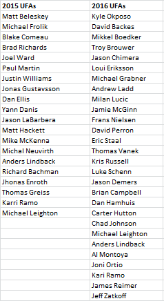 Some of the free agents you mentioned as notable are laughable…Matt Hackett, Anders Lindback, Jhonas Enroth? The first two aren’t even in the NHL, and their stats are pretty awful in the AHL and SHL, and Enroth has been atrocious this year being sent to the AHL in the process. The 2015 class of free agents was garbage, I wouldn’t want anyone from that list. 2016 is debatable, but we still got the best one.