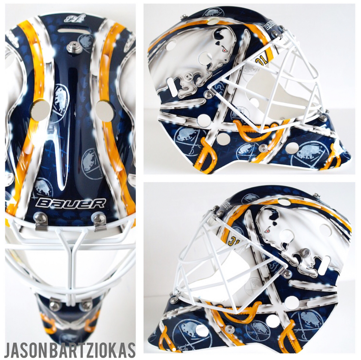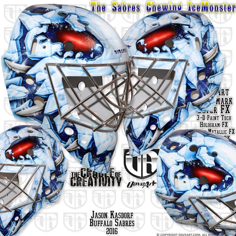 UPDATE #2: After starting the year with his Yeti mask from last year, Kasdorf switched painters (to the same artist who does Johnson’s masks) and updated his look. The new design includes most of the key design cues from his first Sabres/Amerks mask but includes a little more gold and a little less snowy blue.