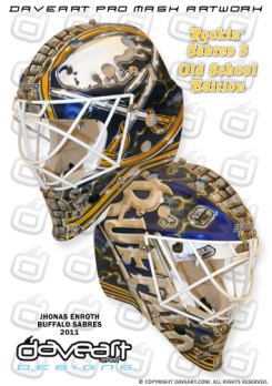 Enroth typically introduced a design in the fall of each season and stuck with it for the duration. He had a few terrific mask designs over the years but may favorite is the mask he wore in 2011. The subtle differences in the jersey stripes that trim the bottom of the mask are excellent as is the vintage treatment Dave Gunnarsson (DaveArt) gave to the 40th anniversary logo. This mask isn’t too heavy on features you need to check out up close, but the overall look is bold and hyper realistic, a feature Gunnarsson has come to own in the world of mask art.