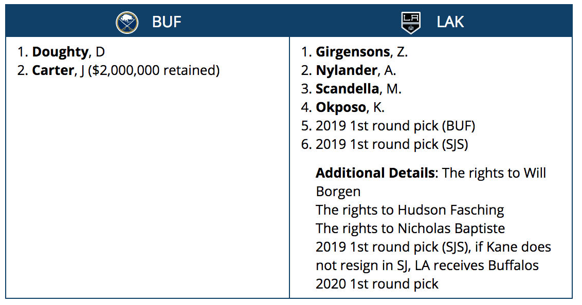 The kicker, of course, is the deal posted above. That’s Drew Doughty AND Jeff Carter for, like, 18 things. Two first round picks (good start), Marco Scandella (okay), Alex Nylander (ehh), Kyle Okposo and Zemgus Girgensons (ha), Hudson Fasching (ha ha), Nicholas Baptiste (random) and Will Borgen (he totally thought Borgen wasn’t going to sign here). That’s a lot of stuff for two elite players and retaining salary no less. Considering at least four of the nine assets listed would have little to no value to the Kings, I’m led to believe that this deal probably wouldn’t get accepted. Maybe not even on a video game.