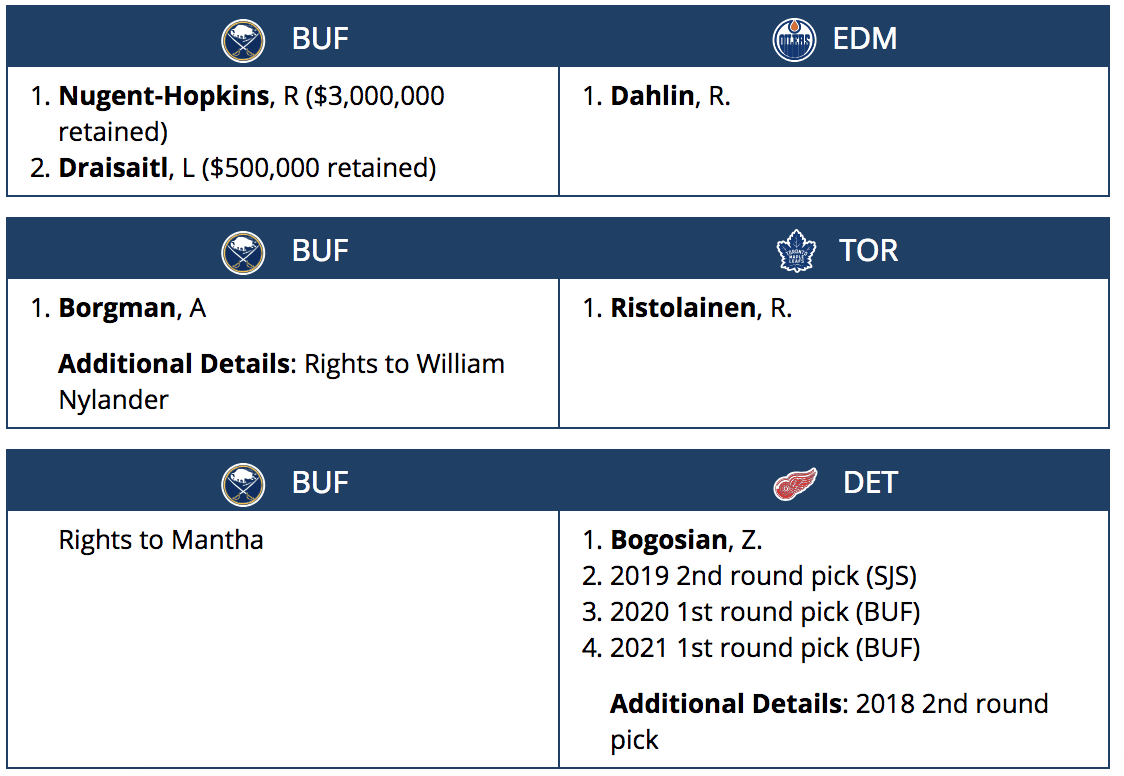 So the end result here winds up being O’Reilly and Ristolainen for Faulk and Nugent-Hopkins in addition to whatever sweeteners would be included. I presume the Carolina swap would see the Sabres gian at least one or two futures in addition to Faulk whereas the Oilers trade would be pretty close as a one-for-one but you might see Edmonton toss in a mid-round pick as a sweetener.