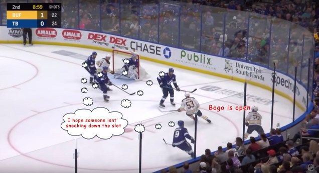 Zach Bogosian enters the zone and sends a hard rim around where Evan Rodrigues retrieves the puck on the right boards. Jack Eichel drives to the crease looking for a centering pass while Jeff Skinner peels off from Rodrigues. Eichel’s drive draws the attention of Anton Stralman while the rest of the Bolts are puckwatching. This allows Zach Bogosian to sneak down the slot after rimming the puck around. And that’s where things go sideways for the Sabres.