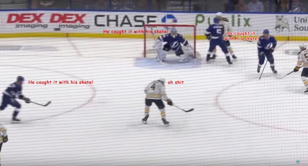 Bogosian is…really open and slow motion and freeze frames sure make it look like the pass is right in his wheelhouse. The full speed replay is more forgiving to him, for what it’s worth. Either way, Bogosian tries to catch the pass with his skate and his lack of success becomes problematic.
