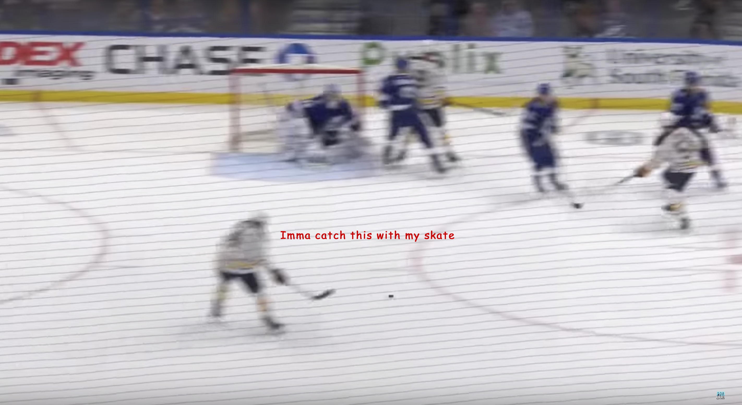 Bogosian is…really open and slow motion and freeze frames sure make it look like the pass is right in his wheelhouse. The full speed replay is more forgiving to him, for what it’s worth. Either way, Bogosian tries to catch the pass with his skate and his lack of success becomes problematic.