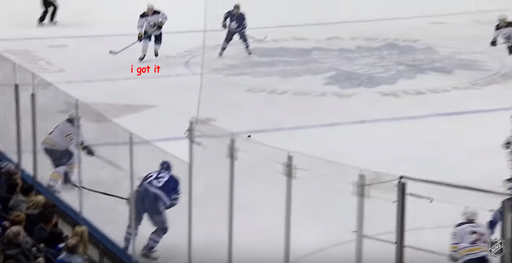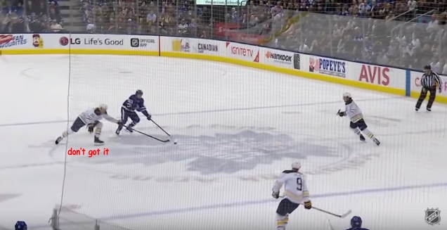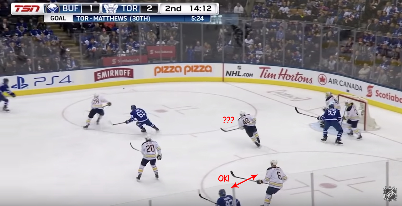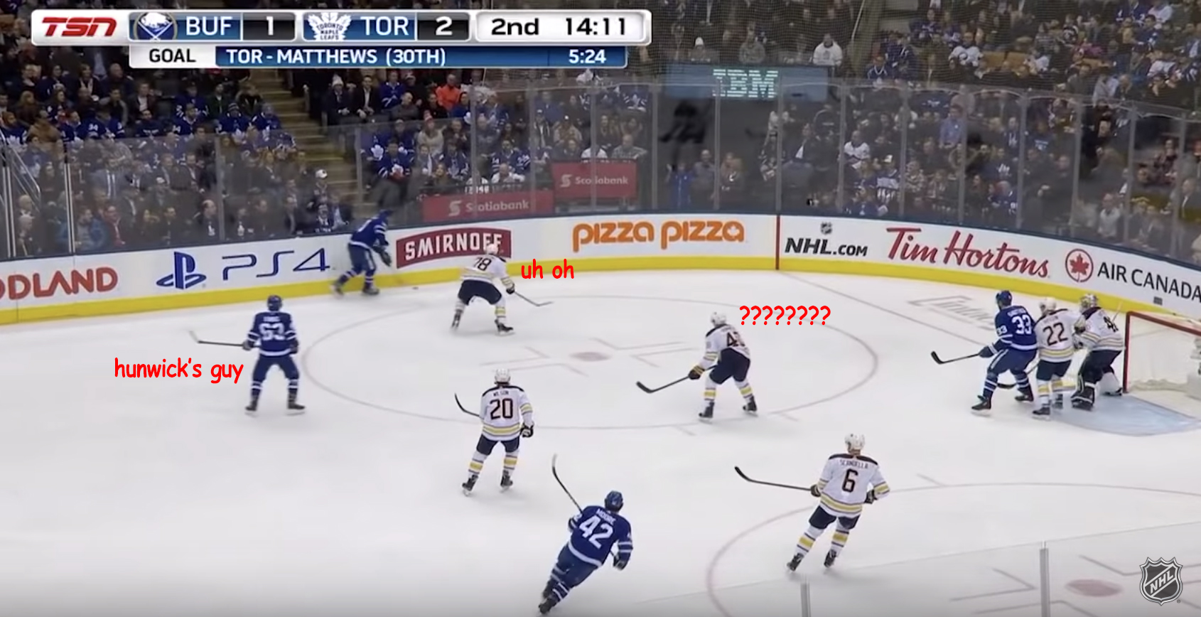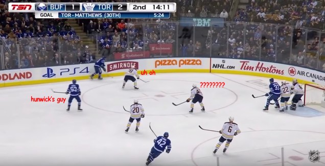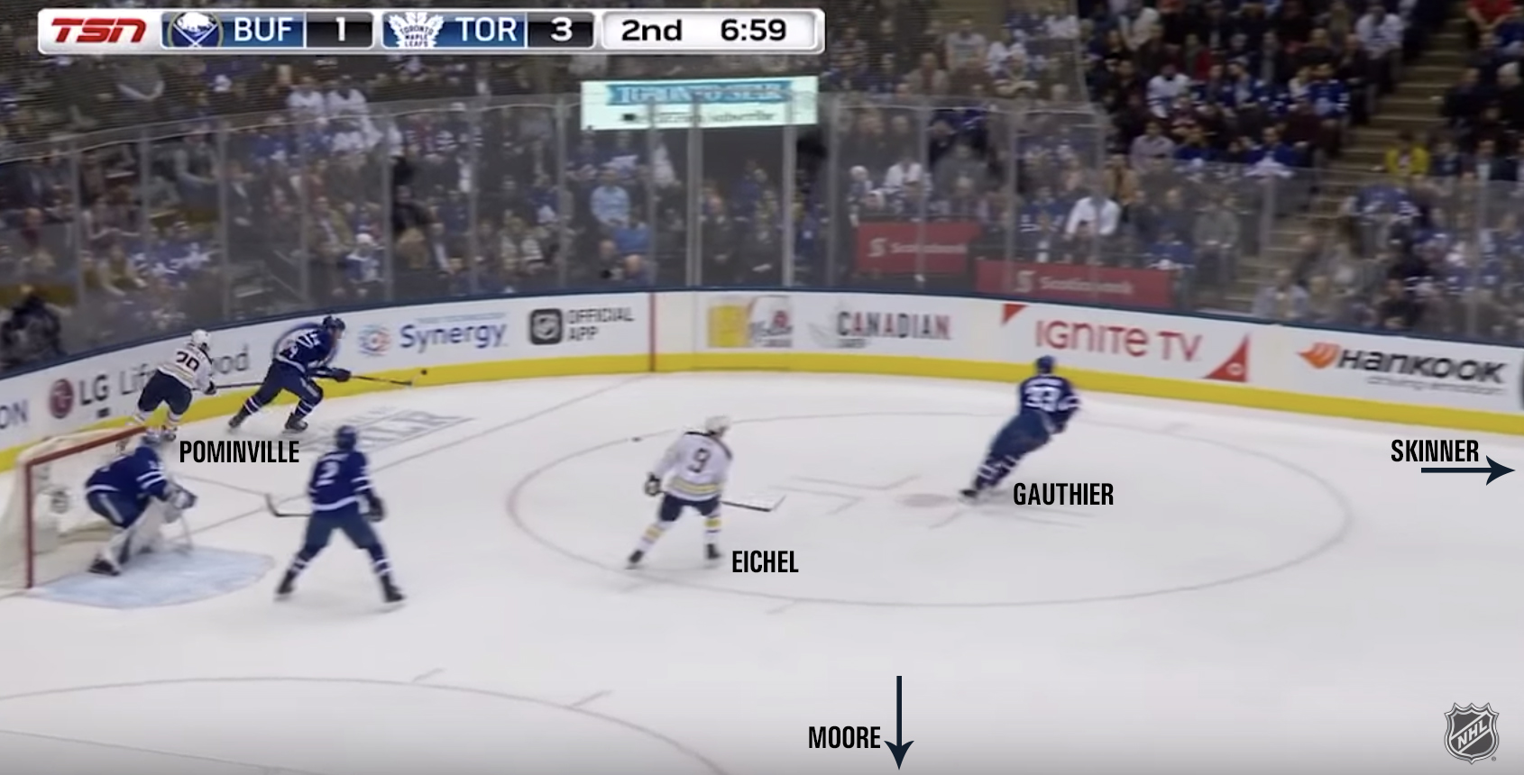 Everything is still kosher at this point. Eichel is directly between Gauthier and Moore and Skinner is in perfect position to force a pass from the Leafs’ center. Tyler Ennis is high in the neutral zone as a stretch option. But even he’s covered. Jake McCabe is out there, as is Rasmus Ristolainen. In the picture above you can kind of see Ristolainen getting in position as he stepped on the ice.
