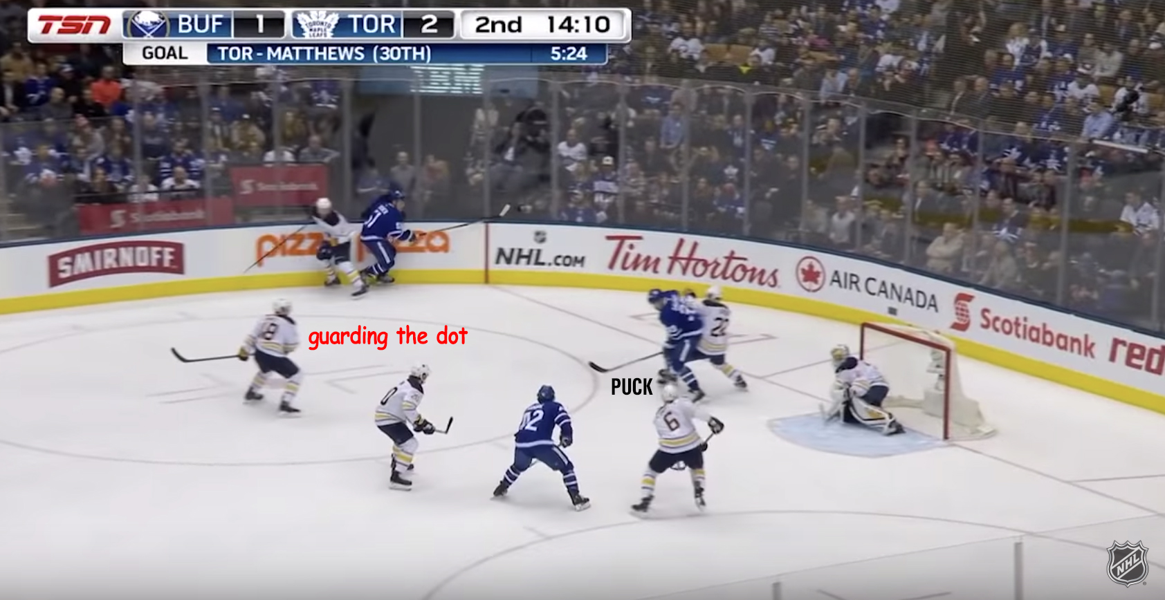 The first was Freddie Gauthier’s backhand that chased Carter Hutton. This goal wasn’t so much a lapse by any one player on the ice. At the core, it was simply a bigger player utilizing good body position against a smaller one, but it highlights some of the oddities about Buffalo’s defensive zone coverage.