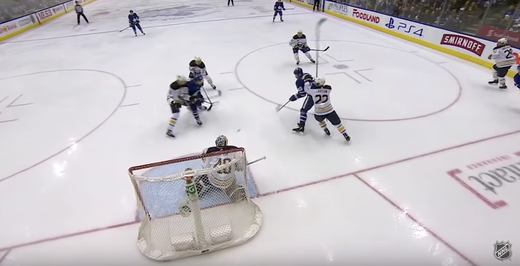 As an aside, Carter Hutton needed to get off the post a little sooner and get higher on the crease. Puck probably hits him in the chest if he’s challenging a bit more.