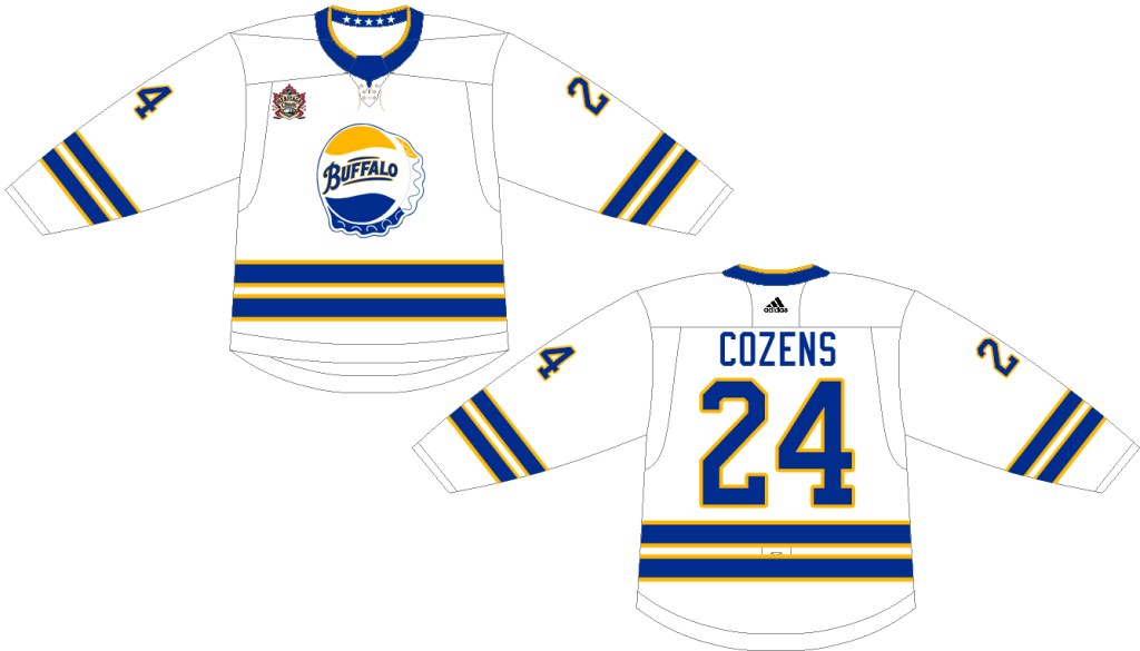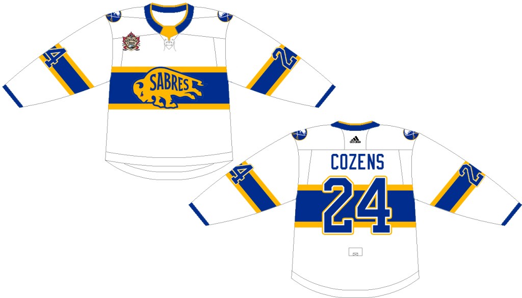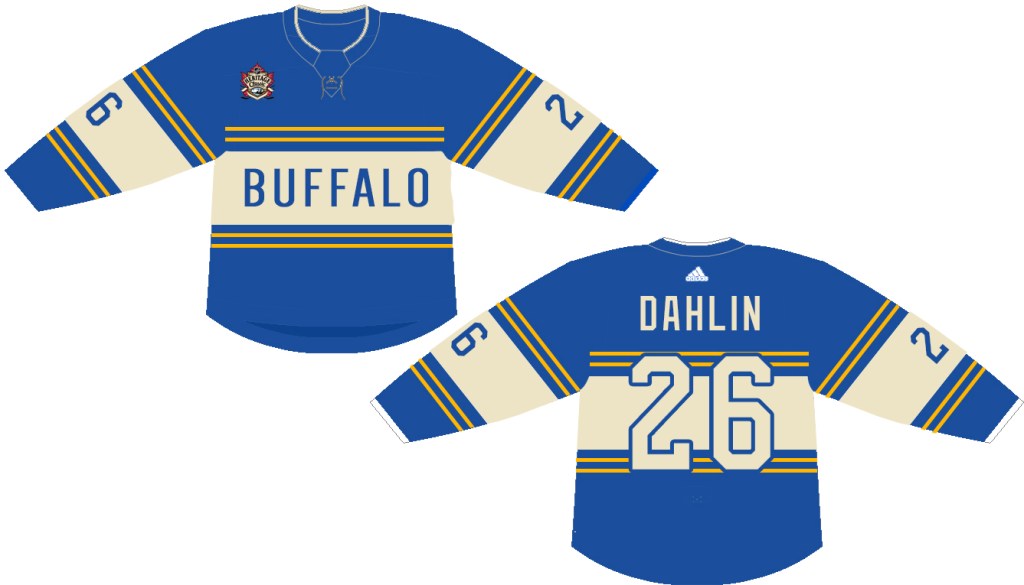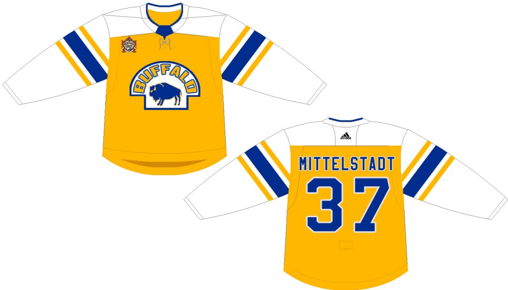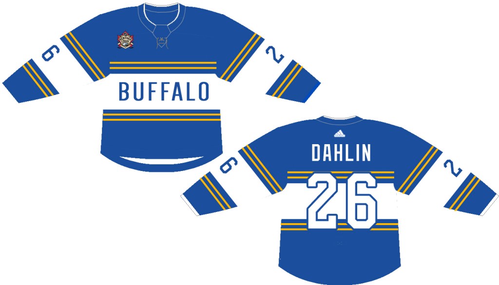 You’ll notice the changes between this concept and the actual jersey worn by the Bisons. Given that recent years have spawned jerseys that either borrow old logos or old colors (but not both) my assumption is that the league and the Sabres would want to keep Buffalo in blue and gold for this game. Additionally, they’d likely be hesitant to brand the jersey for the Bisons, thus a pair of changes to the initial design were going to be necessary.
