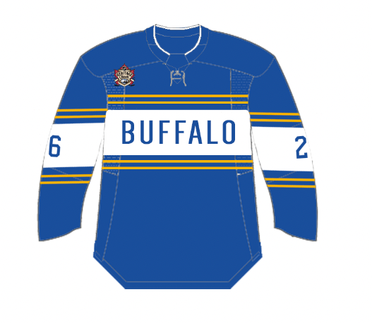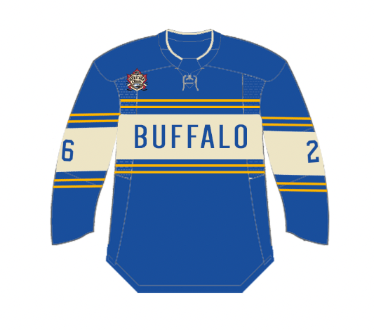 This jersey draws inspiration from the uniforms of the first Buffalo Bisons hockey team which played from 1928-1936 as a member of the International Hockey League. They played their games at the Peace Bridge Arena in Fort Erie, so in a way this design would be fitting for a Buffalo hockey team to wear in a home game being played in Ontario.