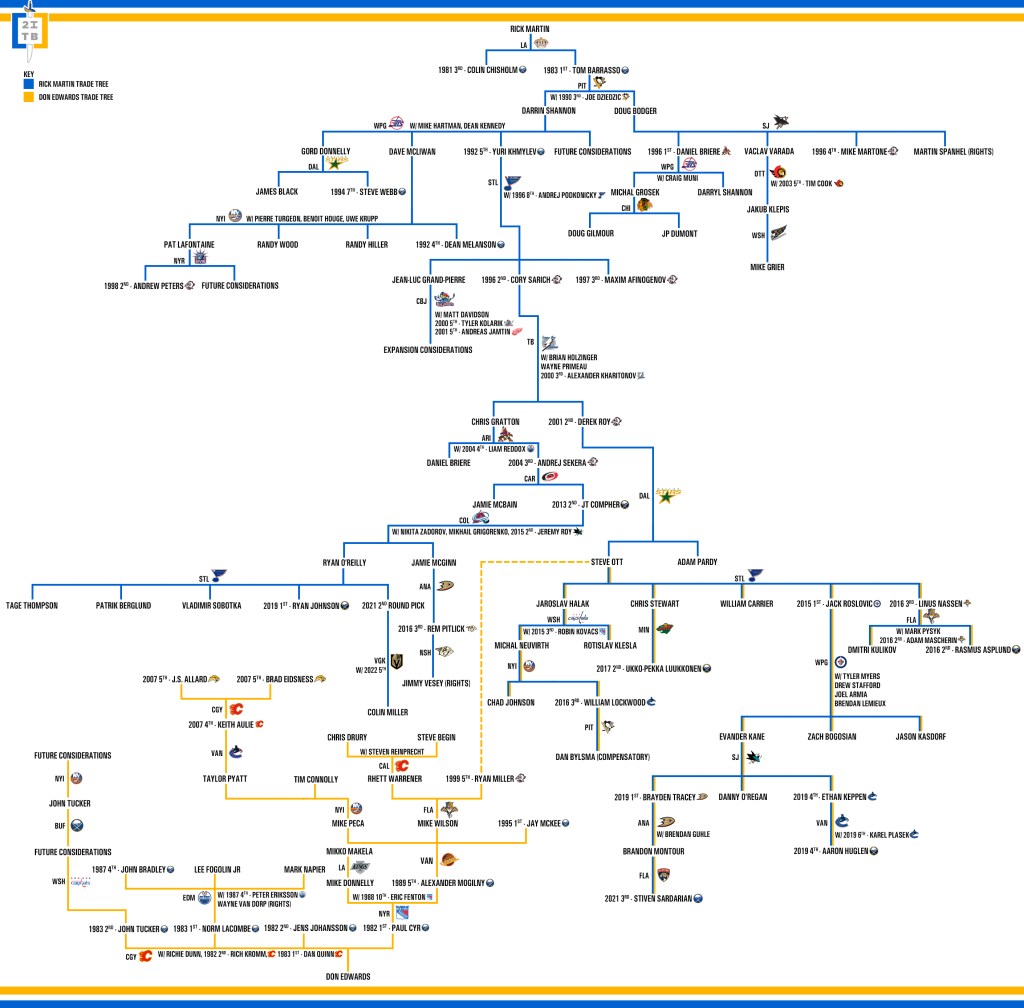 The deadline deal to ship Brandon Montour to the Florida Panthers and the subsequent selection of Stiven Sardarian in the 2021 draft added another leg to the continually expanding Rick Martin trade tree. Given the scope of the image and the generally confusing nature of the layout I chose to use originally, it seemed like it was time to revisit the format and recreate it in a manner that would be easier for people to digest.
