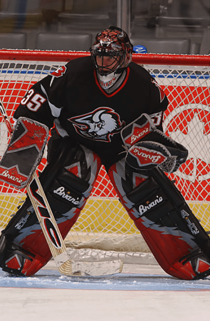 Sheilds entire set up here looks awesome with Buffalo’s black and red uniforms. The red accents on the black pads pop and his choice in blocker is clearly unimpeachable. Full marks all around.