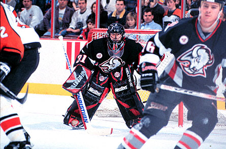 Sheilds entire set up here looks awesome with Buffalo’s black and red uniforms. The red accents on the black pads pop and his choice in blocker is clearly unimpeachable. Full marks all around.