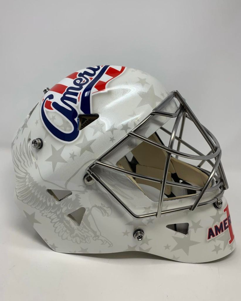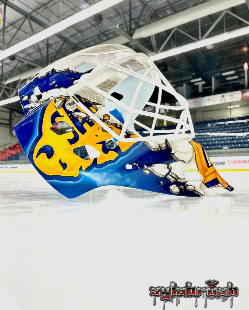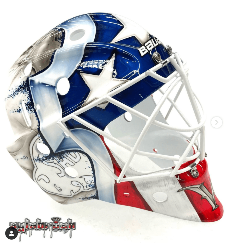 Looking at the masks of the rest of the goalies in the Sabres’ system presents another Sylabrush product (Beck Warm), Gliders Design (Michael Houser) and what I believe is a Skin FX wrap for Malcolm Subban. As an aside, Subban’s Sabres set would look terrific should he be called on at any point this season while Warm’s mask is a terrific application for the Amerks. One of the best I’ve seen in recent years.