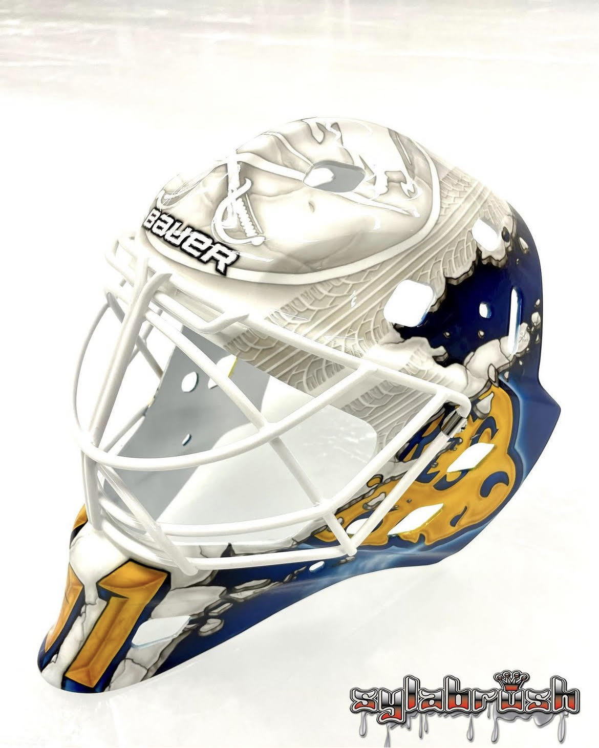 Looking at the masks of the rest of the goalies in the Sabres’ system presents another Sylabrush product (Beck Warm), Gliders Design (Michael Houser) and what I believe is a Skin FX wrap for Malcolm Subban. As an aside, Subban’s Sabres set would look terrific should he be called on at any point this season while Warm’s mask is a terrific application for the Amerks. One of the best I’ve seen in recent years.