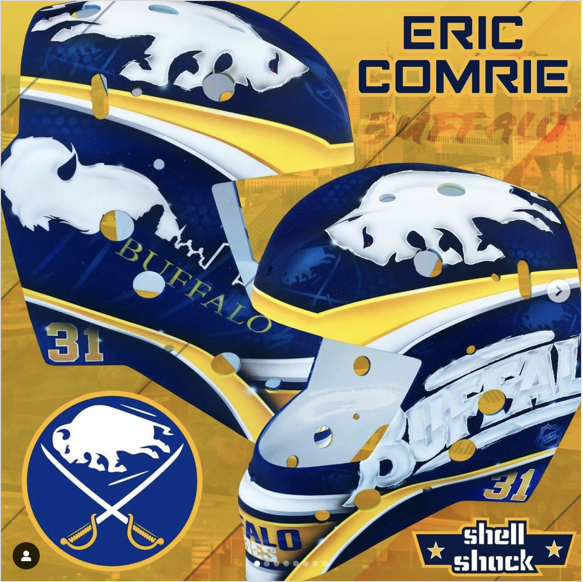 There’s nothing complicated with Comrie’s gear for the season but the simple, understated design looks terrific with Buffalo’s uniforms. The True graphic plays beautifully with the Sabres’ colorway and the mask from Shell Shock Paint brings a new artist into the fold in Buffalo. I especially like the 40th anniversary script on the left side of the mask. The design has a cool effect from distance that’s reminiscent of early 90s or late 80s Sabres masks from the likes of Tom Draper or Darren Puppa.
