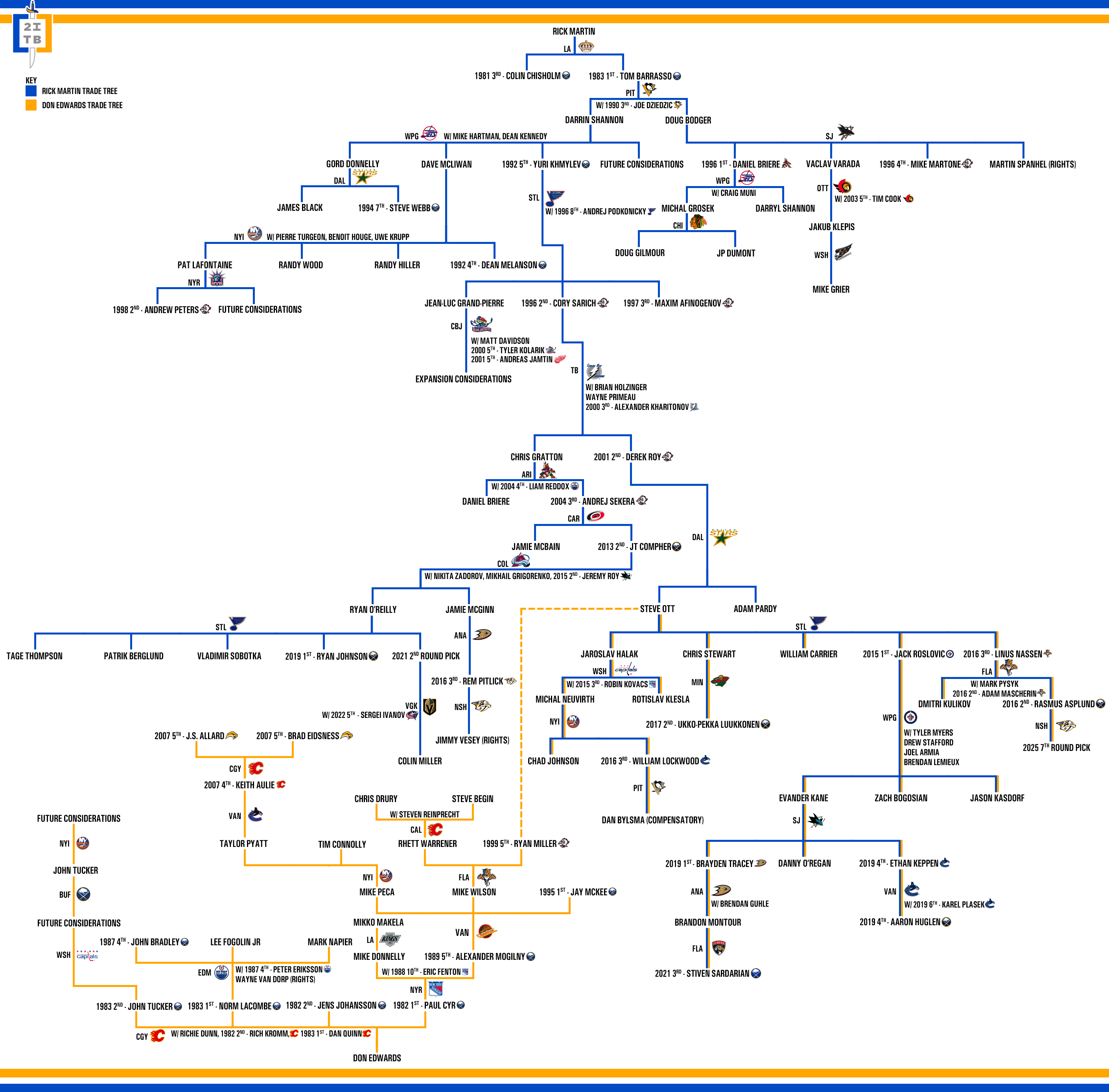 Slowly but surely, the branches on the Rick Martin tree are thinning out. There are only a few areas left where additional trades could extend the tree even further. Rasmus Asplund was one of those few players and his move to Nashville keeps the trade tree going until at least 2027, if not longer depending on the outcome of the seventh round pick they received. The updated version of the trade tree is below. Open the image in a new window if you want the high-res version.