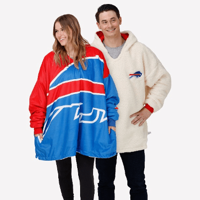 They have a good mix of traditional fan gear and some unique items to go along with them. For example, you can get deep into the fall look with their Buffalo Bills Mens & Womens Plaid Bib Overalls. They have a bold Bills design with red and blue plaid and an oversized Bills logo front and center. Another interesting item is the Buffalo Bills Reversible Colorblock Hoodeez. This oversized, reversible hoodie can make for a great top layer for cold, late-season home games, or for lounging around the house. One side has a massive charging buffalo logo and a red and blue split that will look terrific at a tailgate. The reverse is a white fleece material with a smaller Bills logo. A good look if you’re trying to be a little more incognito, but still super comfy.