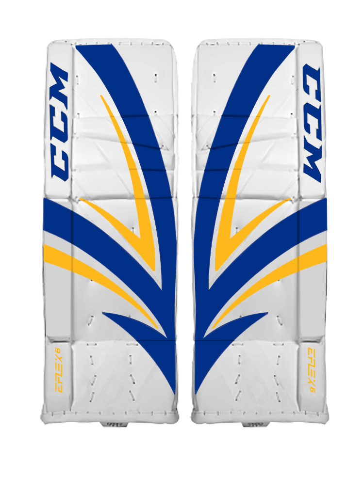 I don’t feel there’s a perfect blue and gold look that Luukkonen (or another Bauer user) could utilize. Before the mid-to-late 1990s when pad design became more refined, Sabres goaltenders wore a lot of random gear. Hasek sported pads from the Cinderella Shoe Shop in Niagara Falls when he first arrived while Grant Fuhr wore Brown. I suppose you could have a company recreate Darren Puppa’s Aeroflex pads but that would be a really obscure set to reference. Hasek moved into Heaton before the team switched colors, and those designs wouldn’t ever adorn a set of Bauer pads. So that leaves Luukkonen in no-mans land a bit when it comes to his base set. His take on the One95 for this season looks great and I thought the graphic he had last year was a cool, unique design. But when it comes to cooking up pad designs for him, there’s not much to go on in blue and gold.