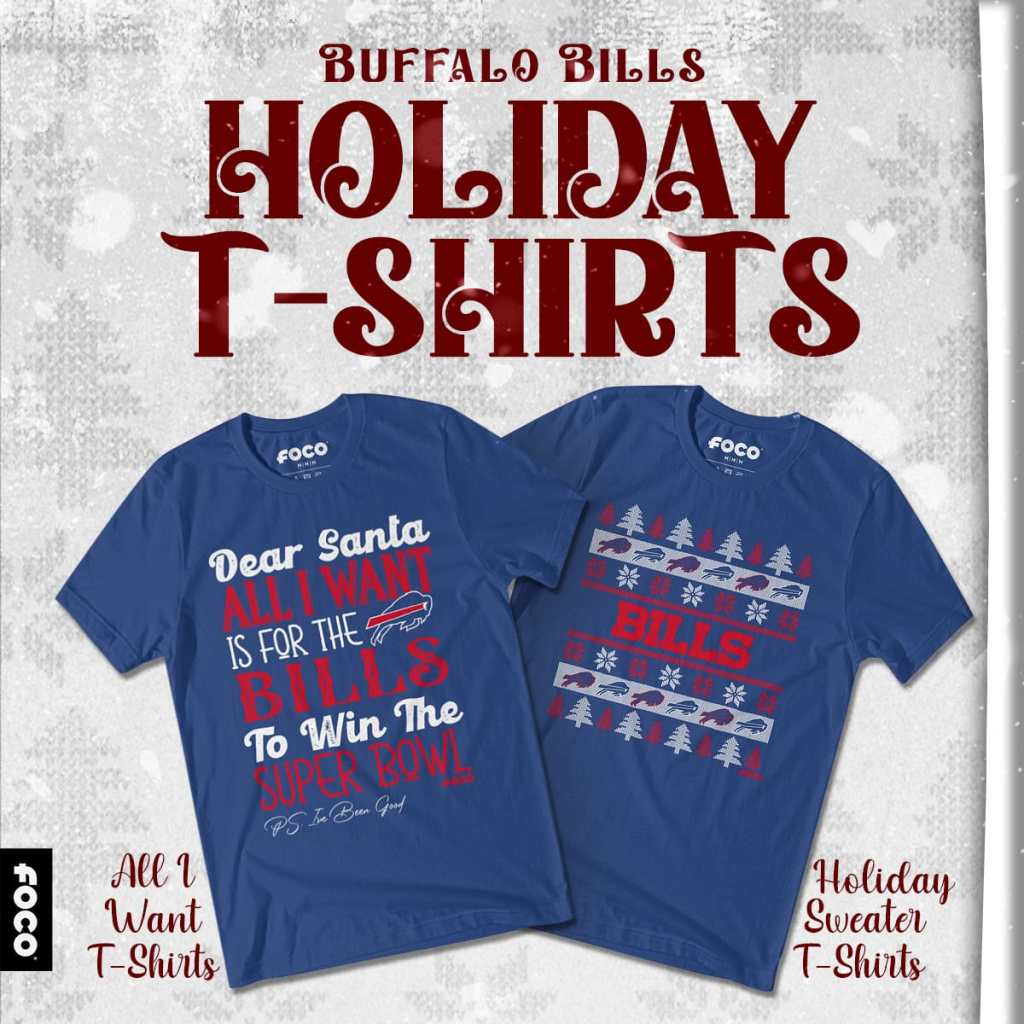 However, the real gem in FOCO’s holiday collection is the, Buffalo Bills All I Want T-Shirt featuring a bold proclamation: “Dear Santa, All I want Is For The Bills To Win The Super Bowl.” This witty and heartfelt message encapsulates the hopes and dreams of every devoted Bills fan. It’s a sentiment that resonates deeply within the fanbase, expressing the ultimate holiday wish: a Super Bowl victory for their beloved team.