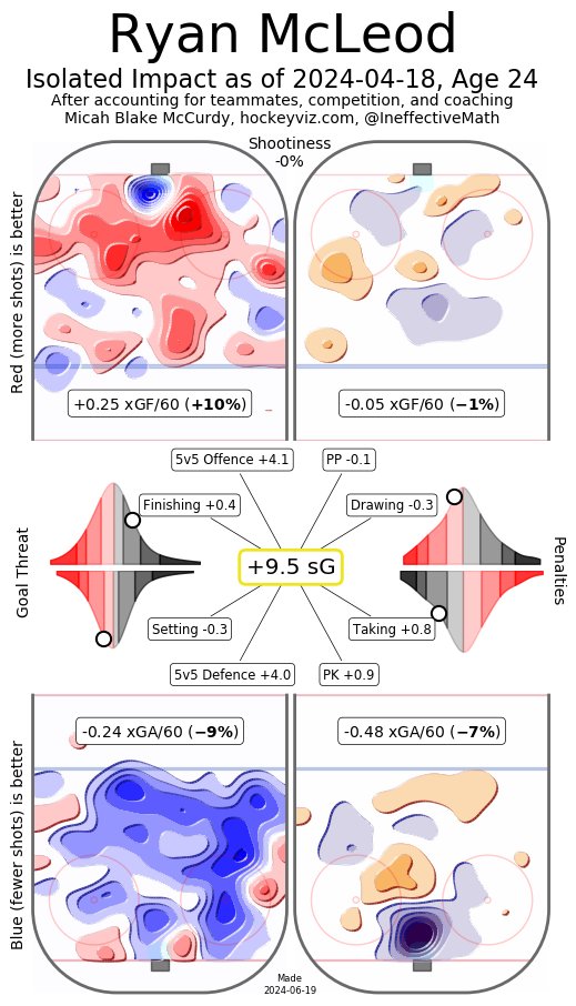 McLeod’s underlying numbers paint the picture of a responsible defensive player whose offense hasn’t quite popped. He was an excellent penalty killer for the Oilers last season and as illustrated by his heat map from Ineffective Math, it’s evident that he has thrived in shot suppression and pushing play away from his goal.