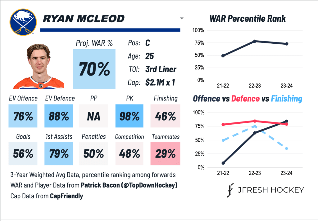 It’s not accurate to say that McLeod gives the Sabres a better option than Mittelstadt offered as the third center, but he certainly offers them a very well-rounded replacement. McLeod’s skill set is precisely what Adams needed to target with his offseason activity, a reassuring result given that a larger trade has yet to materialize.