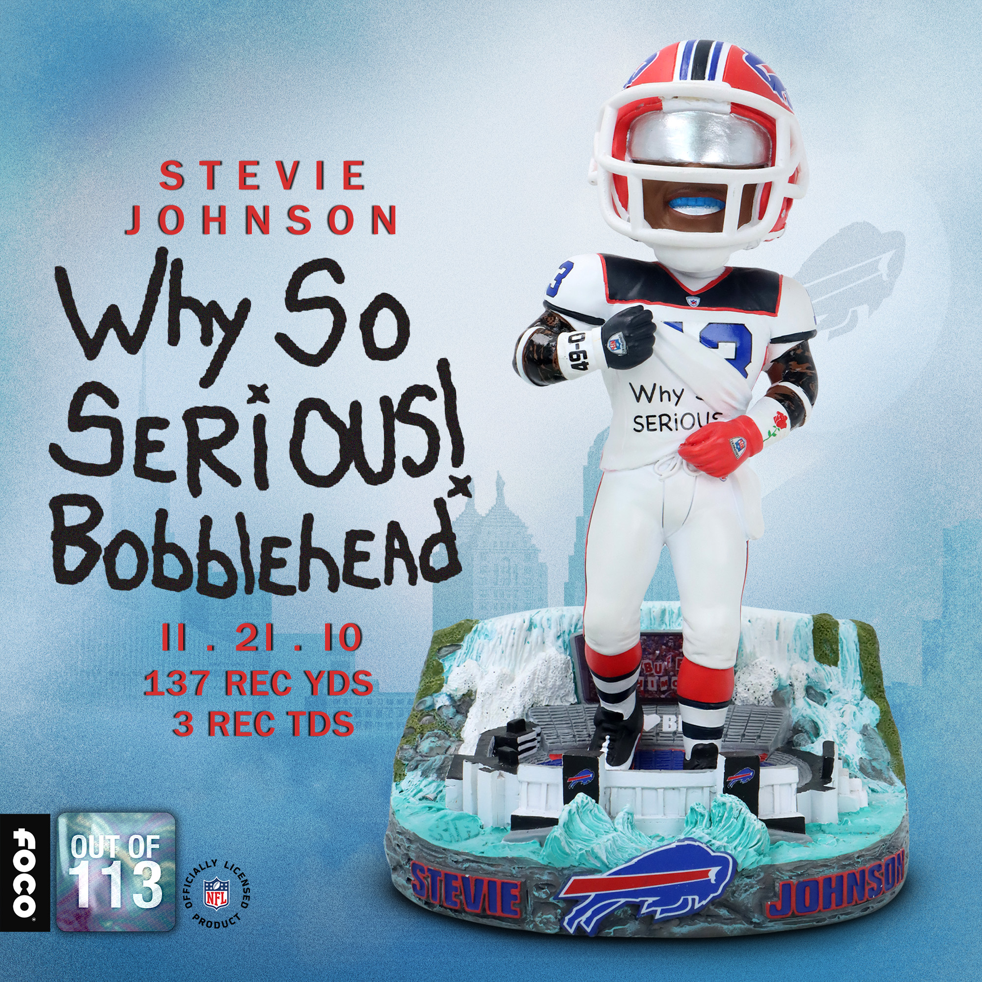 The real prize of FOCO’s newest release is a recreation of an iconic Bills moment: Stevie Johnson’s Why So Serious celebration in Cincinnati. This new Stevie Johnson Buffalo Bills Why So Serious Bobblehead is numbered to only 113, meaning you need to act quick to add this to your Bills collection. The bobblehead features Johnson, pulling up his jersey to show off the query scrawled on his undershirt. Johnson is standing in a recreation of Highmark Stadium, sporting the Bills white uniform and red helmet from the era.
