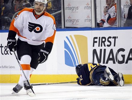 Jhonas Enroth was chased after giving up three and Ryan Miller didn’t fare much better, giving up four during his time in net. Each goalie had one that they should have stopped – Simmond’s first for Enroth and Voracek’s for Miller – but each were hung out to dry for the whole night. Even on the two that should have been saved, the defense were either out to lunch (Simmonds) or the entire five-man unit were coasting back on defense (Voracek).