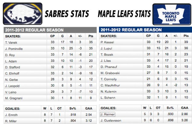 Goaltenders. Ryan Miller finally came down off the his hot streak that helped him lead the Sabres into playoff contention. Of course, fans are only looking at the last two games when evaluating him; exactly what I’ve come to expect from a town with such hockey IQ. Miller needs to play a strong game, hopefully the two days off helped him a bit. I’ll maintain that he should have rested Friday, however. As for the Leafs. I would have to assume that Ben Scrivens will be back in net. The Sabres put three by him on Saturday, they just need to play a little better D and continue to pepper the youngster.