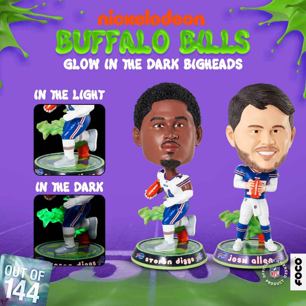 Doug, Rugrats, Hey Arnold!, Spongebob. GUTS The Nickelodeon catalog is vast and elite and today, you can grab your own awesome piece of the Nick universe with FOCO’s Josh Allen and Stefon Diggs 2023 Nickelodeon Glow in the Dark Bighead Bobbleheads.